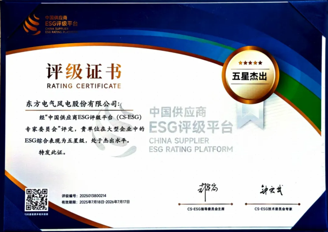 东方风电立足企业高质量发展与目标实现,围绕国家战略与行业转型、“双碳”目标落地等方面,主动履行央企社会责任,树立国企典范。在环境、劳工与人权、可持续采购、社会贡献、公平运营与ESG公司治理等多方面落实可持续发展理念,最终获评“中国供应商ESG评级(大型企业)五星杰出”企业。